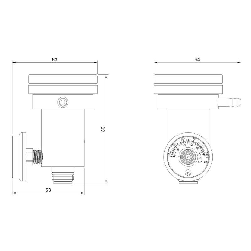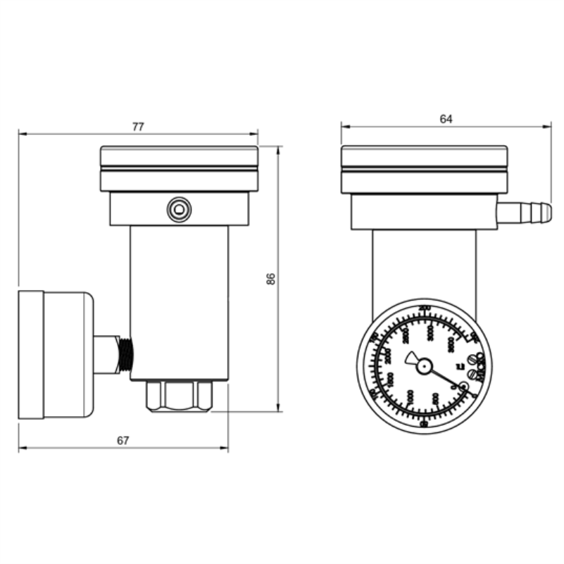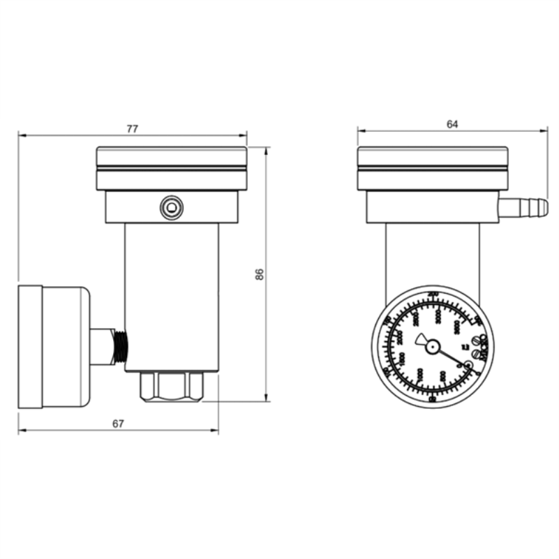5003 | 0 to 3000 psig / 207 bar | Brass NP for Non-reactive Gases | 0 to 3" H20 / 5.6 mm Hg | ¼" NPT-F | 3/16" Barb 4.8mm | Stainless Steel 0 to 3190 psig 220 bar | 0.470 Kg |