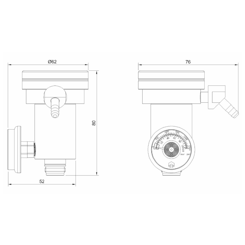 5002 | 0 to 1200 psig / 83 bar | Stainless Steel for Reactive Gases | 0 to 3" H20 / 5.6 mm Hg | 5/8" x 18UN C10 | 3/16" Barb 4.8mm | Stainless Steel 0 to 1500 psig 103 bar | 0.430 Kg |