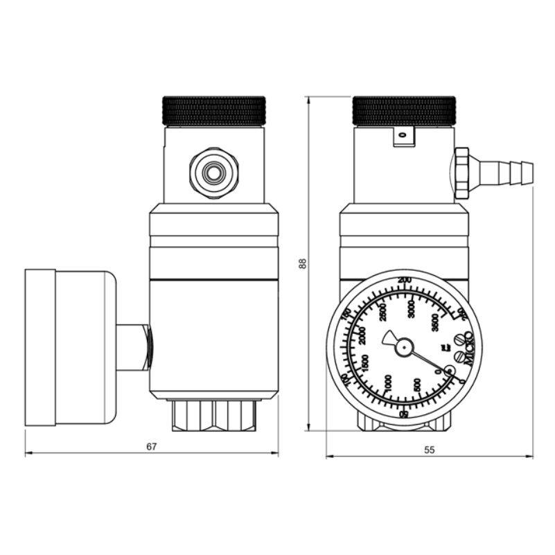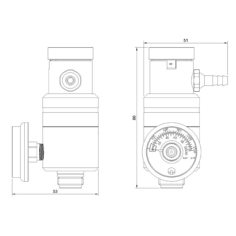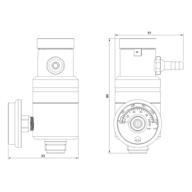 2001 | 0 to 1200 psig / 83 bar | Brass NP for non-reactive gases | Refer flow rate table | 5/8" x 18UN C10 | 3/16" Barb 4.8mm | Brass 0 to 1500 psig 103 bar | 0.350 Kg |