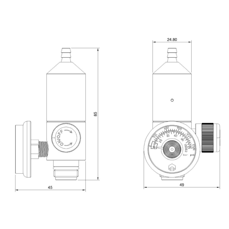 907 | 0 to 1740 psig / 120 bar | Stainless Steel for Reactive Gases | 5/8" x 18UN C10 | 3/16" Barb 4.8mm | 60 psig - 4.1 bar | Stainless Steel 0 to 3000 psig 220 bar | 0.280 Kg |