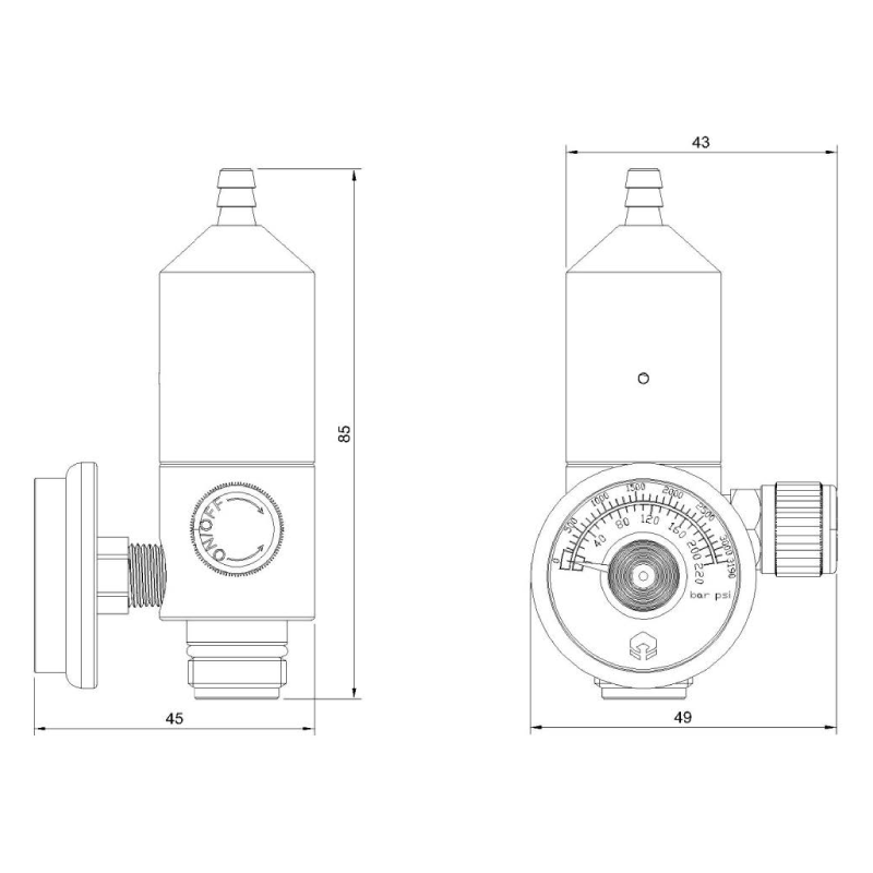 901 | 0 to 600 psig / 40 bar | Brass NP for Non-reactive Gases | 1" x 20 UNF CGA600 | 3/16" Barb 4.8mm | 30 psig - 2.1 bar | Brass 0 to 600 psig 40 bar | 0.330 Kg |