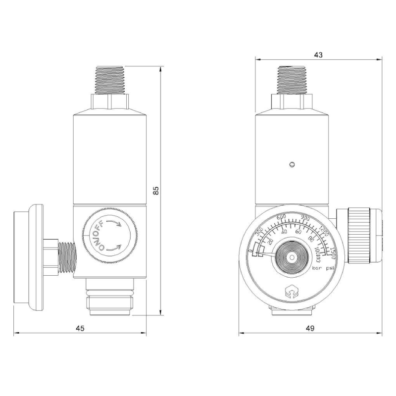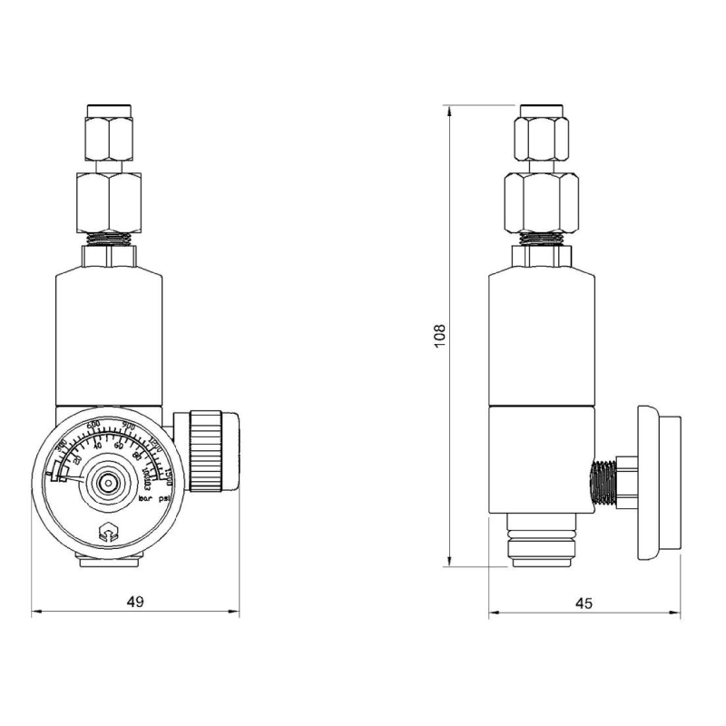 911 | 0 to 1200 psig / 83 bar | Stainless Steel for Reactive Gases | 5/8" x 18UN C10 | 1/8" Compression Fitting | 60 psig - 4.1 bar | Stainless Steel 0 to 1200 psig / 103 bar | 0.258 Kg |