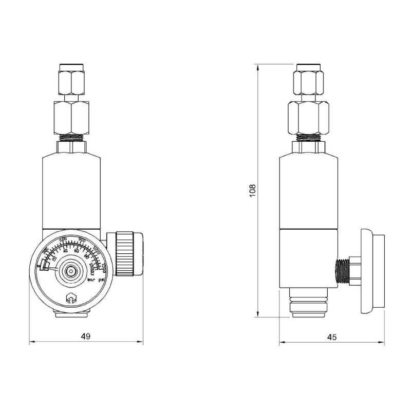 908 | 0 to 1200 psig / 83 bar | Brass NP for Non-reactive Gases | 5/8" x 18UN C10 | 1/8" NPT Male | 60 psig - 4.1 bar | Brass 0 to 1200 psig / 103 bar | 0.300 Kg |