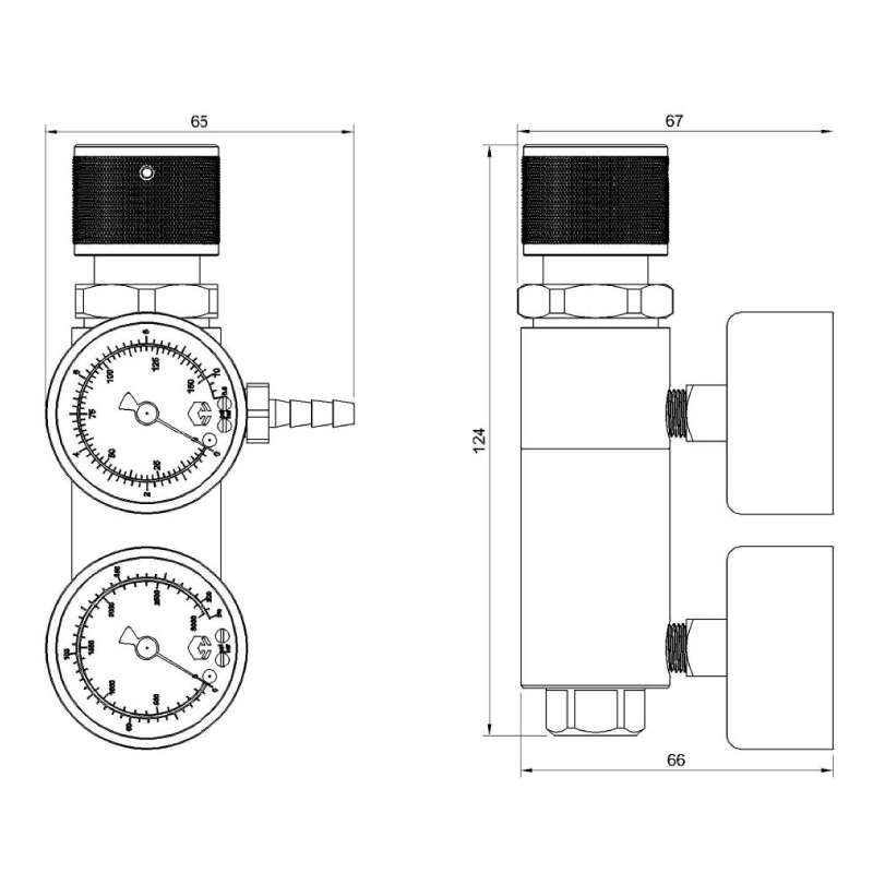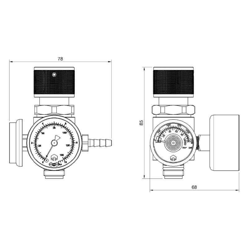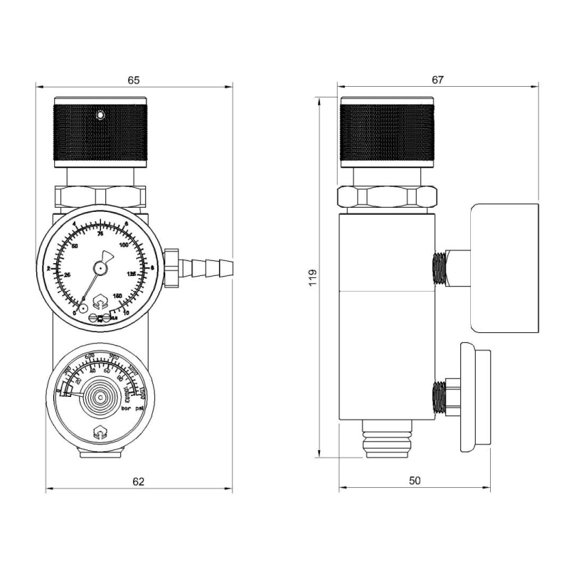 1210 | 0 to 1200 psig / 83 bar | Brass NP for non-reactive gases | 5/8" x 18UN C10 | 3/16" Barb 4.8mm | Stainless Steel 0 to 1500 psig / 103 bar | 0.570 Kg |