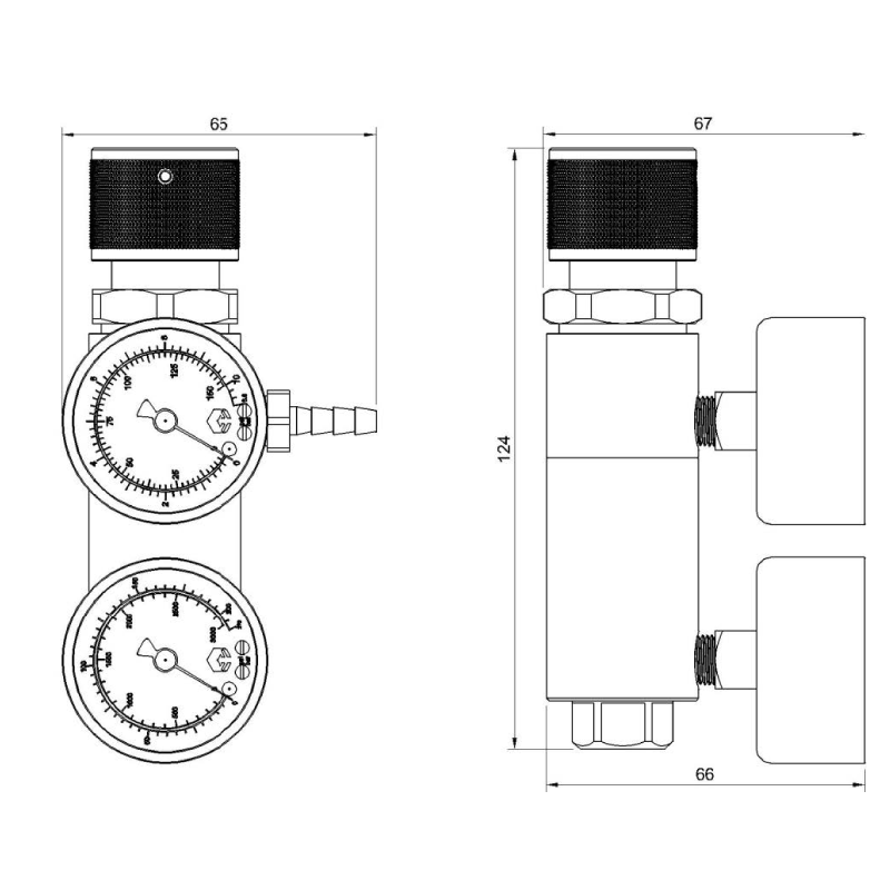 1230 | 0 to 3000 psig / 207 bar | Brass NP for Non-reactive Gases | ¼" FNPT | 3/16" Barb 4.8mm | Brass 0 to 3190 psig / 220 bar | 0.660 Kg |
