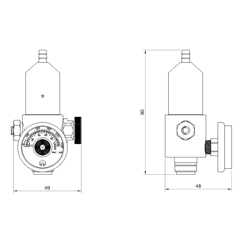 302 | 0 to 1200 psig / 83 bar | Brass NP for non-reactive gases | 5/8" x 18UN - C10 | 3/16" Barb | 60 psig - 4.1 bar | Brass N.P. 0 to 1500 psig / 103 bar | 0.326 Kg |