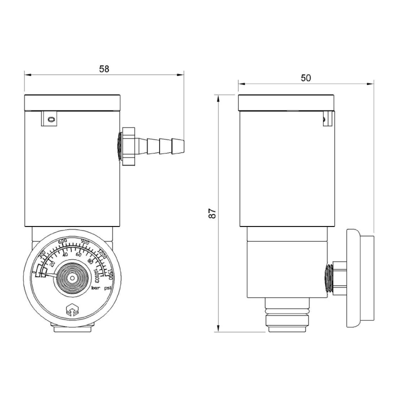 3002 | 0 to 1200 psig / 83 bar | Aluminium Anodized for Non-reactive Gases | Refer flow rate table | 5/8" x 18UN C10 | 3/16" Barb 4.8mm | Brass 0 to 1500 psig 103 bar | 0.200 Kg |